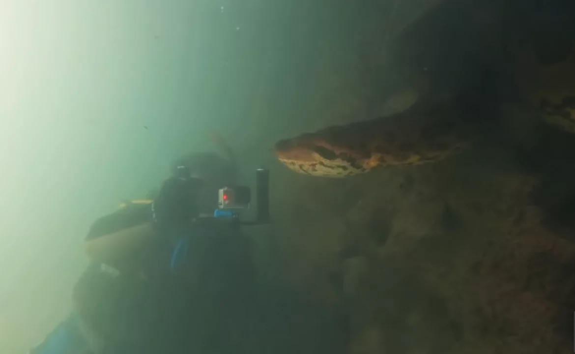El momento en que dos buzos se encuentran cara a cara con una anaconda de siete metros