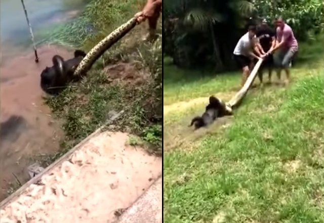 Un grupo de personas que estaba buscando a un perro perdido lo encontraron en plena lucha con un gigantesco reptil que lo estaba asfixiando a orillas de un río en Brasil.