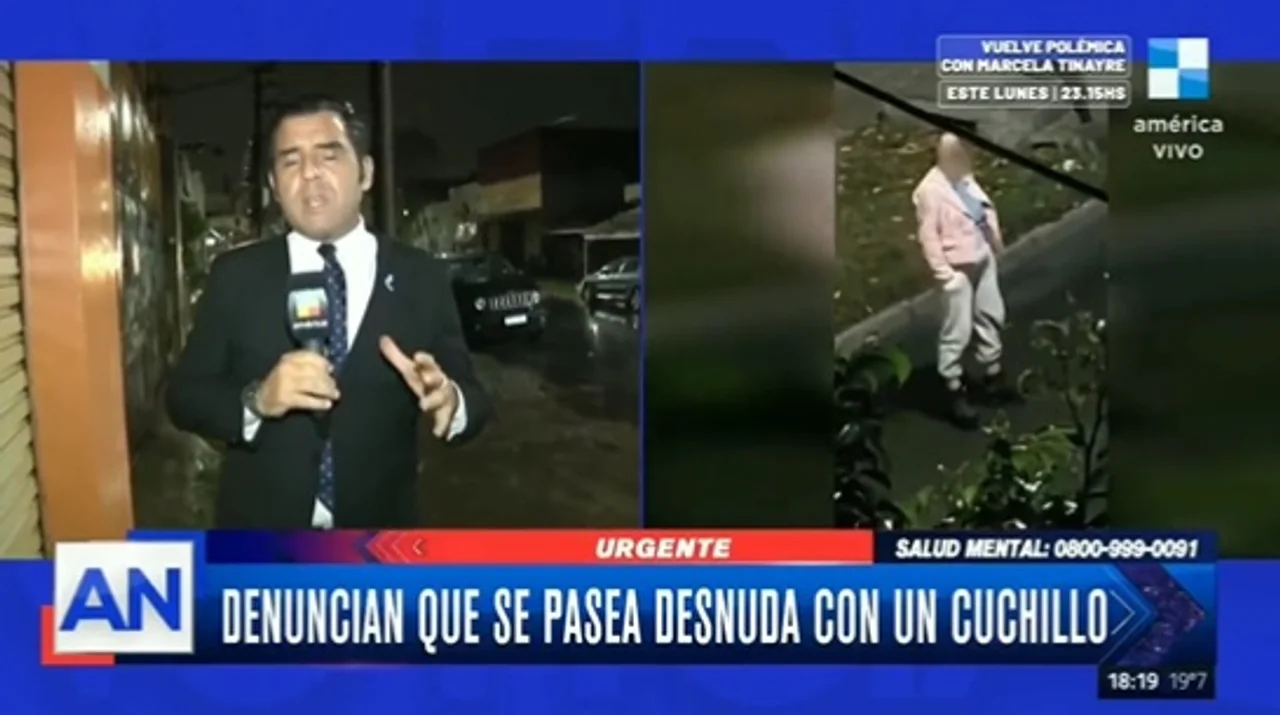 Hacía una nota sobre la mujer que se pasea desnuda con un cuchillo... ¡y apareció en vivo!