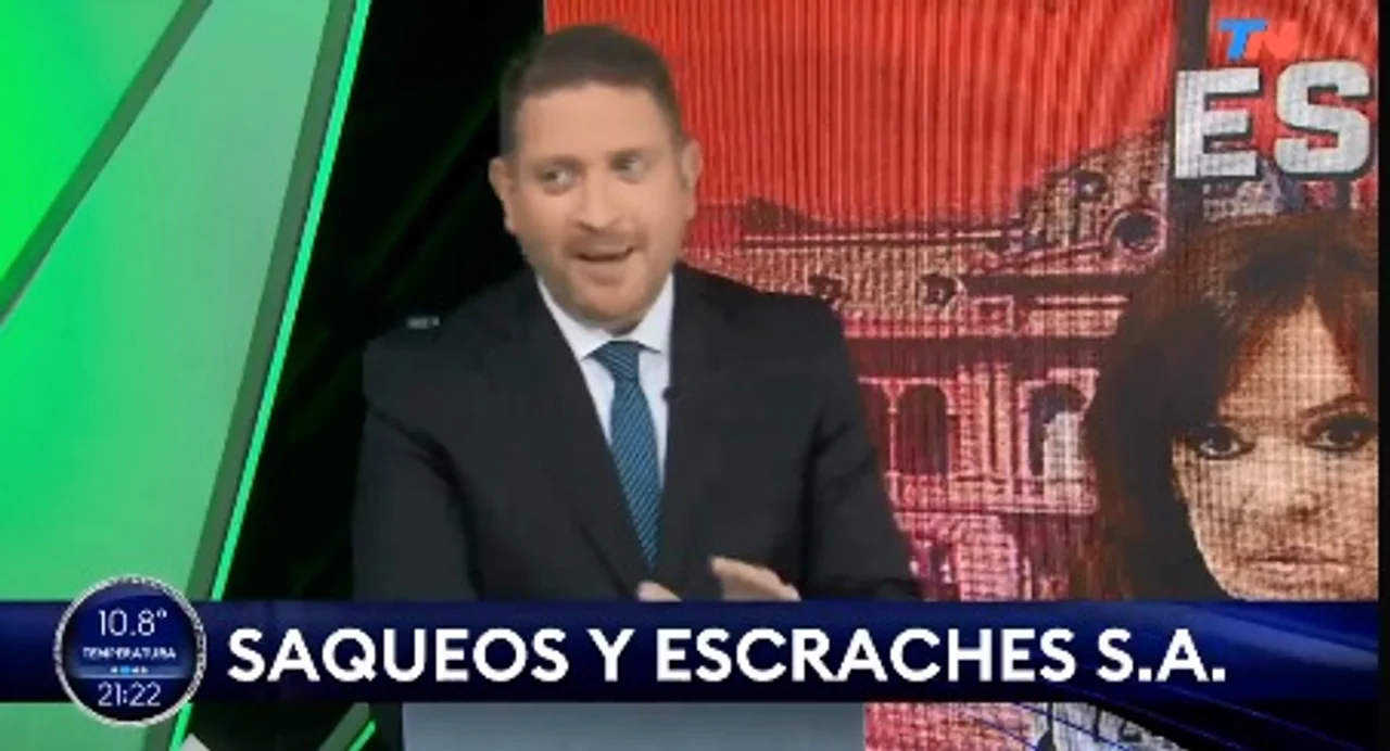 El periodista armó en TN un informe titulado 'Saqueos y escraches S.A", y colocó la cara de Cristina Kirchner en la pantalla. Para él hay una industria detrás de las quejas y cánticos públicos contra el presidente.