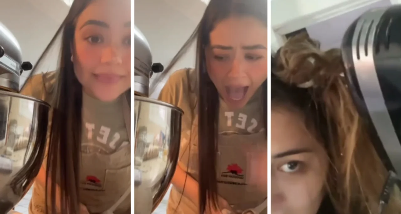 Esta joven se hizo viral en las redes sociales por mostrar su intento de cocinar una torta, pero terminó con la batidora enroscada en el pelo.