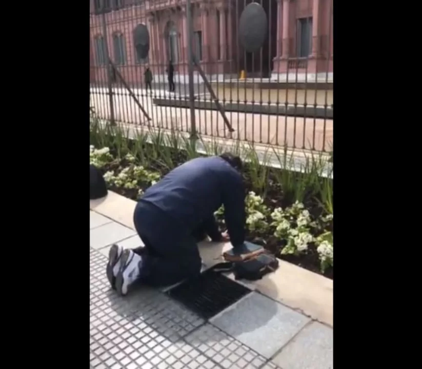 Crónica subió a sus redes imágenes de un curioso rezo, sobre todo por el lugar donde este hombre se inclinó. Ante la reja de la casa de Gobierno este religioso pidió al Señor que "tome el control de sus vidas", luego de quejarse de las manifestaciones populares.