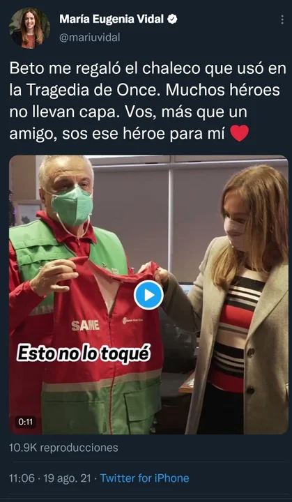 La precandidata por Juntos en la Ciudad subió a la redes un video en el que Alberto Crescenti, titular del SAME, le regala un chaleco que usó en la tragedia de Once. Vidal se mostró feliz y conmovida por ello y en las redes repudian el aprovechamiento político.